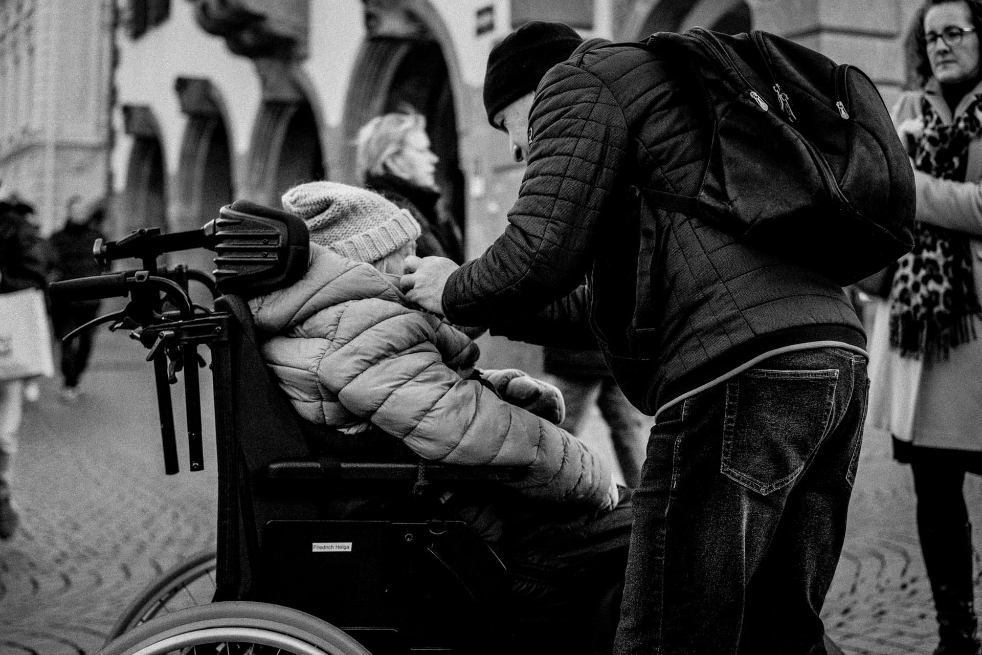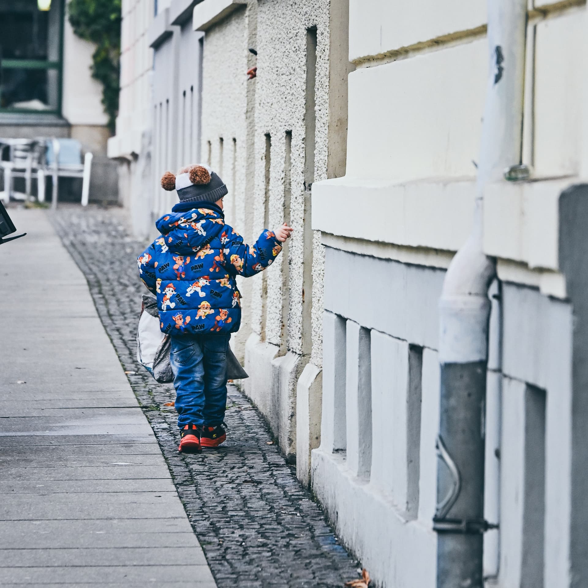 Street: Leute mit Tüten und Glühwein, Kinder am Karussell, Verkäufer:innen, Security, Musiker:innen